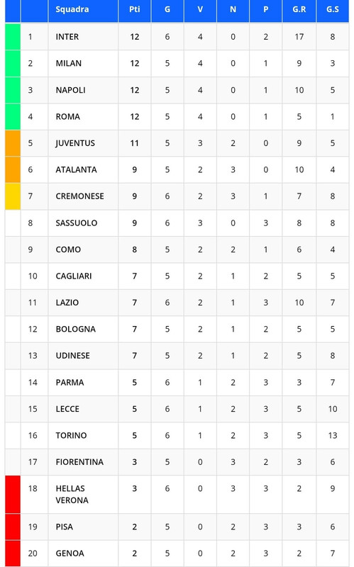 Ecco la classifica provvisoria della sesta giornata di Serie A: