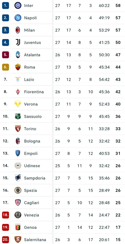 L'Inter, grazie al rotondo successo per 5-0 contro la Salernitana, sale a quota 58 punti e vola nuovamente al primo posto in attesa di Napoli-Milan. I granta, invece, restano fermi a quota 15 punti e non riescono ad abbandonare l'ultimo posto. Questa la classifica provvisoria della Serie A: