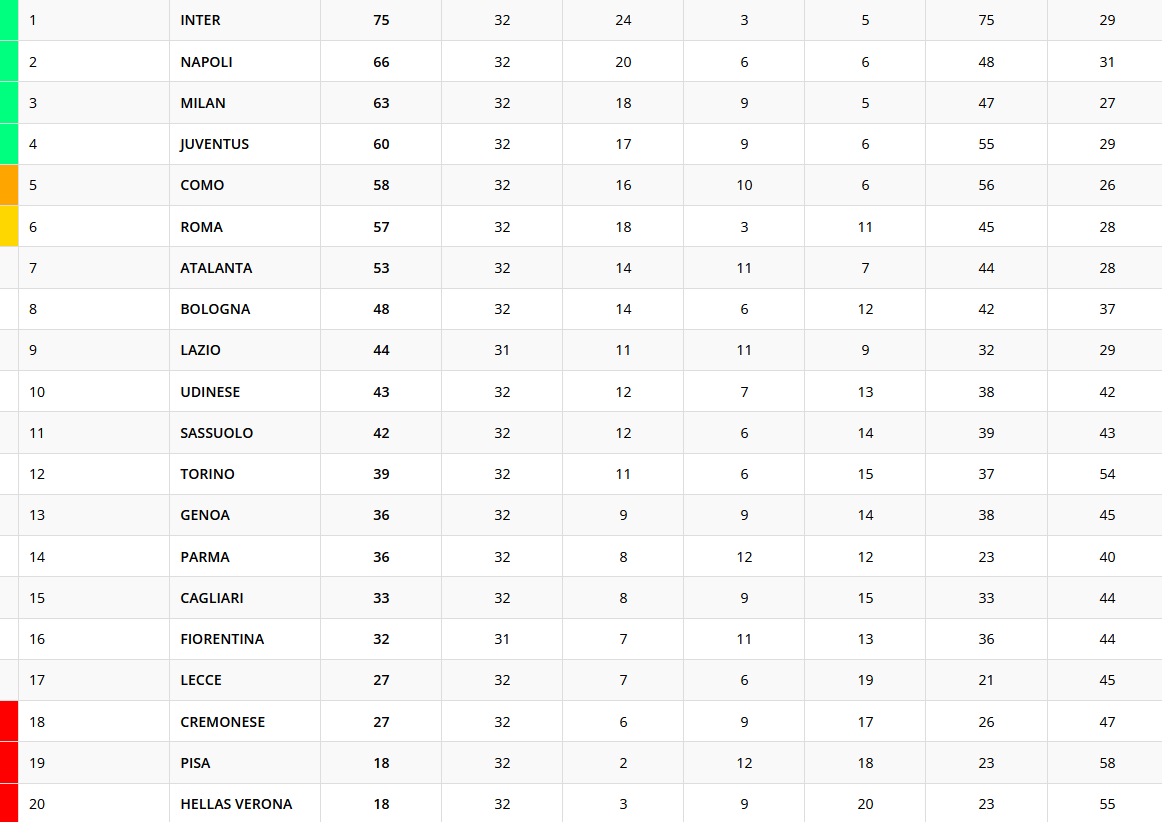 L'Inter vince 4-3 in casa del Como, nel match valido per la 32esima giornata di Serie A. Thuram e Dumfries portano i nerazzurri a quota 75 punti, a + 9 sul Napoli. La squadra di Fabregas resta al quinto posto a quota 58 punti. Ecco la classifica provvisoria della 32esima giornata.