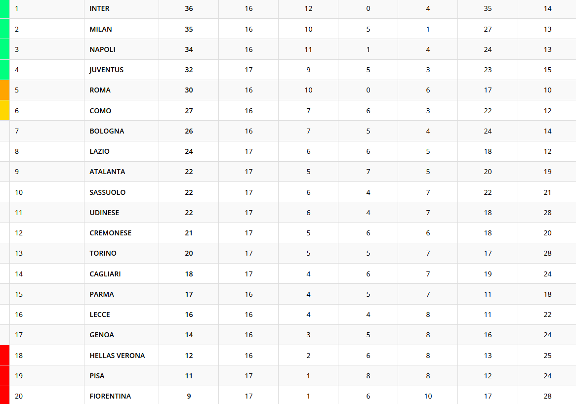 L'Inter vince in casa dell'Atalanta, nel match valido per la 17esima giornata di Serie A, e chiude il 2025 in vetta alla classifica, a quota 36 punti. La Dea resta, invece, a quota 22 punti con Udinese e Sassuolo. Ecco la classifica provvisoria della 17esima giornata.