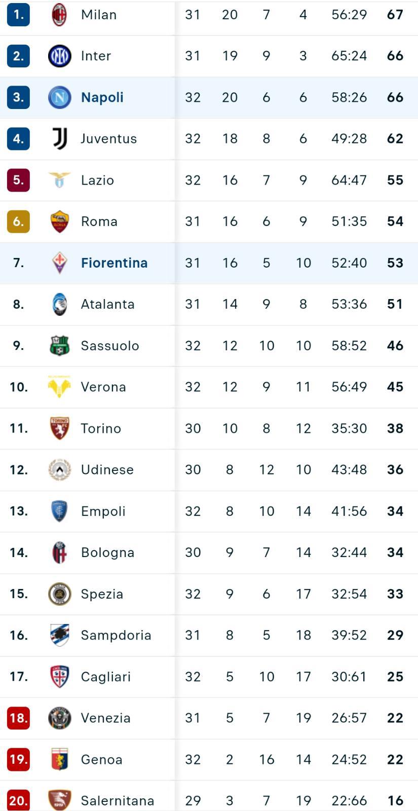 Il Napoli cade al Maradona, con la Fiorentina che ferma la corsa scudetto degli azzurri. La squadra di Spalletti resta a quota 66 punti, a parimerito con l'Inter che ha una partita in meno. La Fiorentina scavalca l'Atalanta al settimo posto. Il Sassuolo batte l'Atalanta e mette fine ai sogni Champions della Dea, che resta a 51 punti. Il Venezia perde con l'Udinese e resta nella "zona rossa" della classifica.