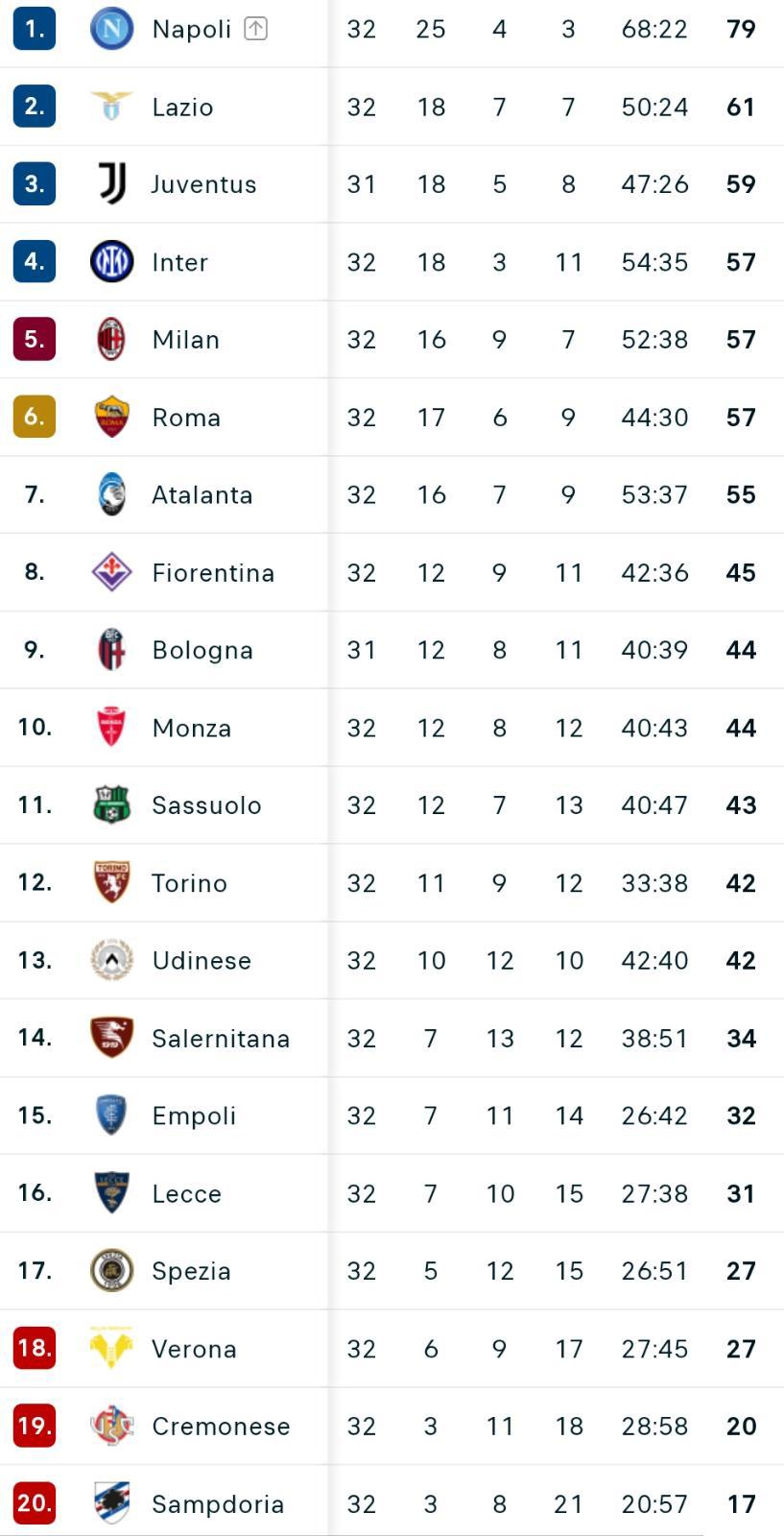 Con un netto 5-0, la Fiorentina batte la Sampdoria e supera in classifica il Bologna e il Monza, portandosi a 45 punti. Sempre ultima la squadra di Stankovic con 17 punti. Di seguito la classifica provvisoria.