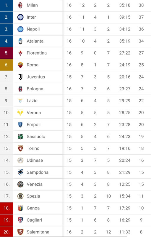 La Fiorentina di Vincenzo Italiano, dopo la bella vittoria per 2-3 sul campo del Bologna, si trova ora al quinto posto in classifica ed è a soli 7 punti dalla zona Champions League in attesa delle altre partite del 16° turno di Serie A. Questa la classifica provvisoria: