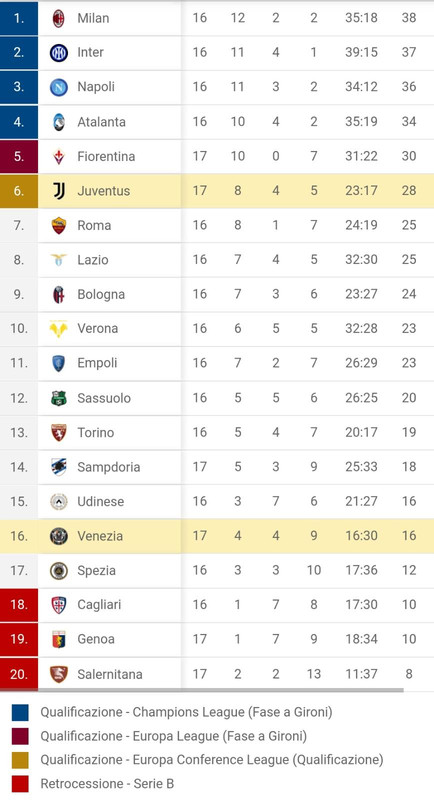 Con il pari contro il Venezia, la Juventus sale a quota 28 e resta a -2 dalla Fiorentina. La squadra di Zanetti aggancia l'Udinese. Di seguito la classifica aggiornata.