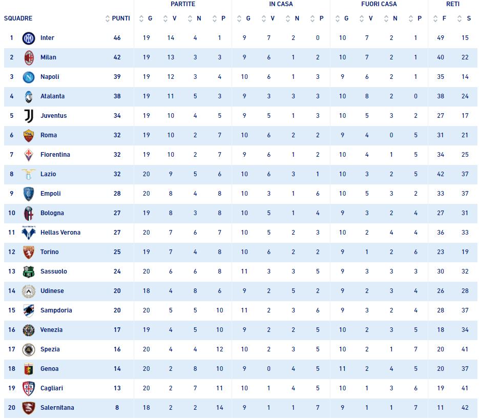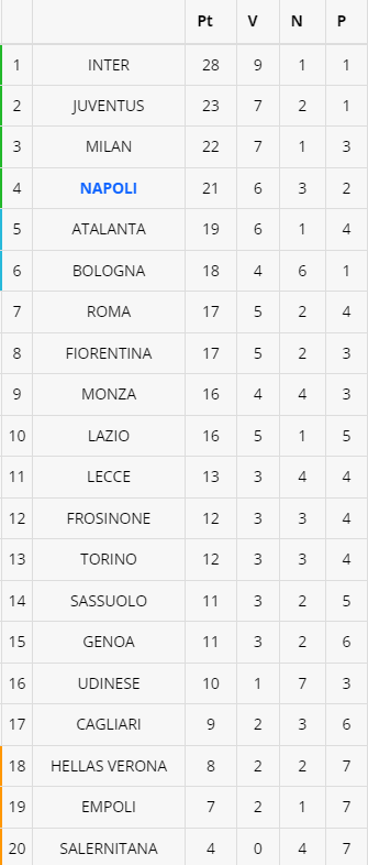 La Roma vince in rimonta contro il Lecce all'Olimpico e sale a quota 17 punti, agganciando la Fiorentina (in campo alle 20:45 contro la Juventus). Il Lecce resta a quota 13 punti. Di seguito la classifica provvisoria.