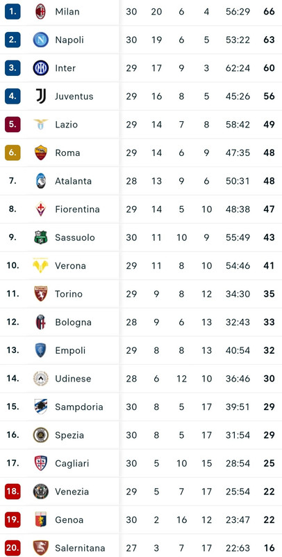 La Sampdoria, grazie al successo per 0-2 sul campo del Venezia nello scontro salvezza, sale a quota 29 punti e si porta a +7 sulla zona retrocessione. I lagunari, invece, restano fermi a quota 22 punti e restano al terzultimo posto. Ecco la classifica provvisoria della Serie A: