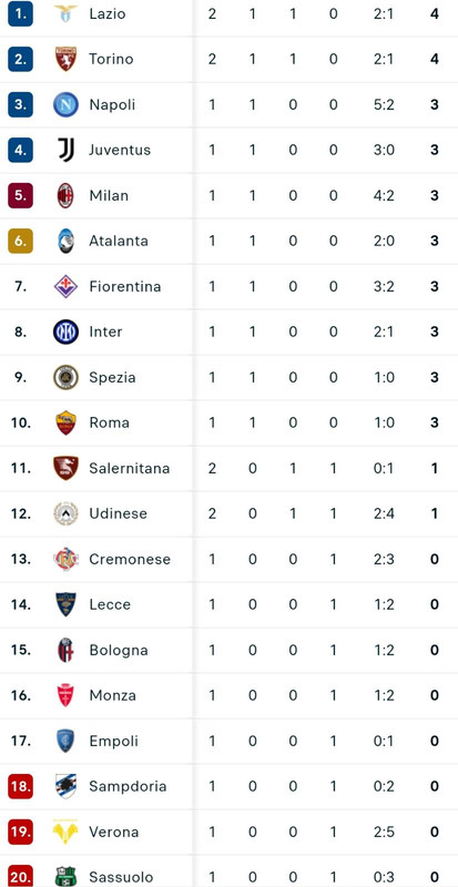 Alle 18:30 si sono giocati i primi due match della seconda giornata di Serie A. Due pareggi tra Torino e Lazio e Udinese e Salernitana. Ecco la classifica aggiornata.