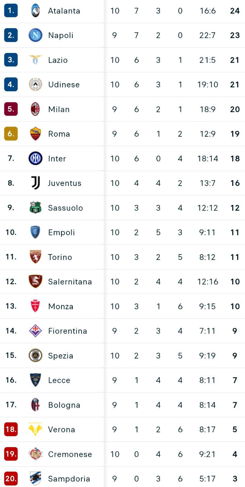 Termina 0-0 il match tra Lazio e Udinese all'Olimpico. Sarri e Sottil salgono a quota 21 punti e staccano momentaneamente il Milan. Sono 9 i punti dello Spezia, mentre la Cremonese sale a quota 4. Di seguito la classifica aggiornata.