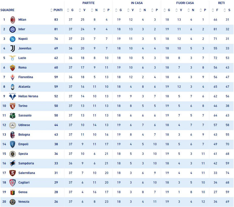 Lo Scudetto di quest'anno si deciderà all'ultima giornata. Questo è il verdetto dopo che l'Inter ha vinto il confronto contro il Cagliari per 1-3 restando, dunque, a -2 dal Milan in vetta ad una giornata dalla fine. Ufficiale, invece, la retrocessione del Genoa in Serie B.