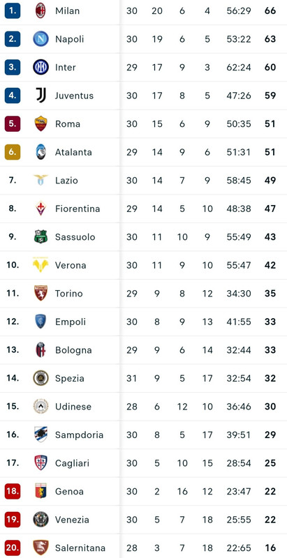 Lo Spezia, dopo la preziosa vittoria per 1-0 arrivata nel finale dello scontro salvezza con il Venezia, sale a quota 32 punti e si porta a + 10 sulla zona retrocessione. I lagunari, invece, restano fermi a quota 22 punti a -3 dalla salvezza. Ecco la classifica provvisoria della Serie A: