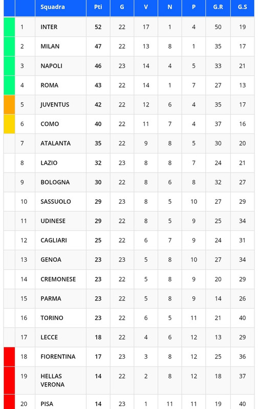 SERIE A - La classifica provvisoria: Napoli a -1 dal Milan secondo e –6 dall’Inter