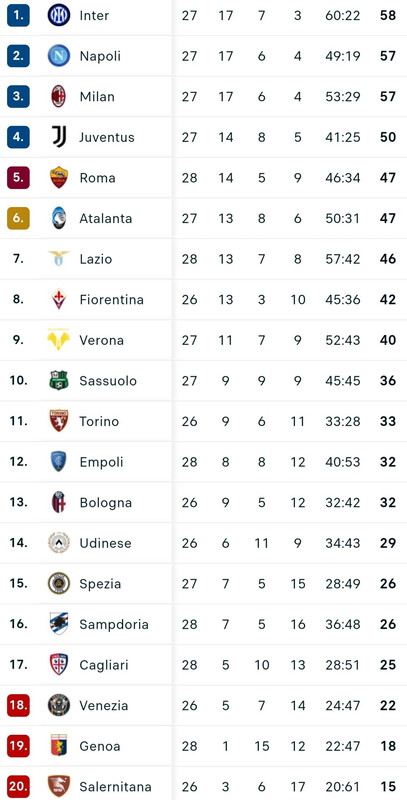 Il Genoa, dopo il pareggio contro l'Empoli, il sesto consecutivo in campionato, sale a quota 18 punti e si porta a -7 dalla zona salvzza. I toscani, invece, salgono a quota 32 punti e aggancciano il Torino all'undicesimo posto. Questa la classifica provvisoria della Serie A: