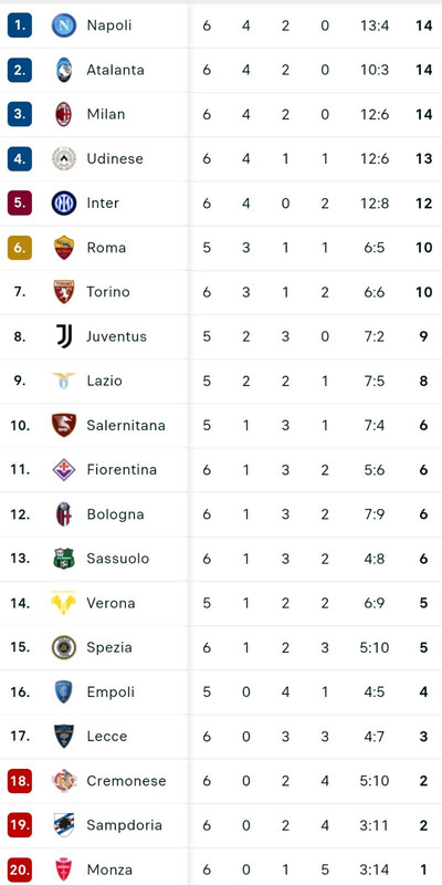 L'Udinese vince contro il Sassuolo e vola a quota 13 punti, a -1 da Napoli, Milan e Atalanta in vetta. Successo anche per il Bologna che si porta a quota 6 punti. Primo punto in classifica anche per il Monza, dopo l'1-1 contro il Lecce. Di seguito la classifica provvisoria.