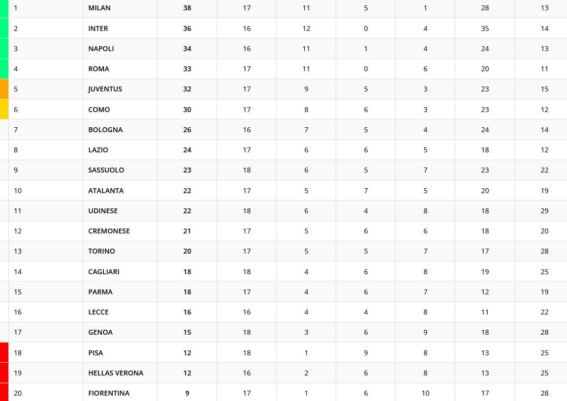 Terminano in parità i match del sabato della 18esima giornata: Sassuolo-Parma 1-1 e Genoa-Pisa 1-1. I neroverdi si portano a quota 23 punti, a -1 dalla Lazio. Il Genoa sale a quota 15 punti, a -3 dal Parma che si porta a 18 punti. Il Pisa aggancia il Verona a 12 punti. Ecco la classifica provvisoria della 18esima giornata di Serie A.