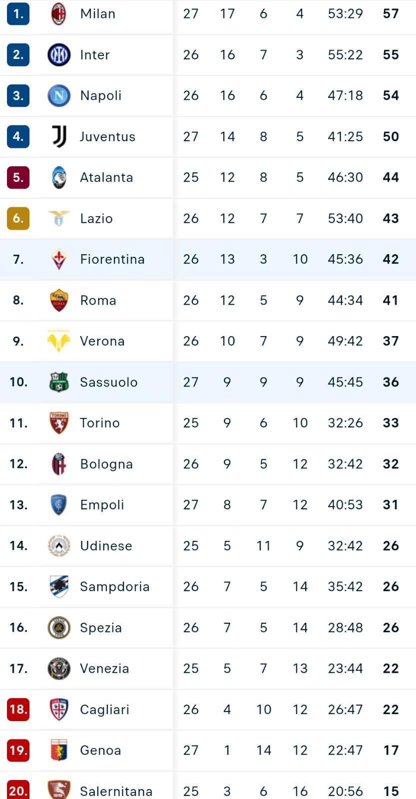 Il Sassuolo batte nel recupero la Fiorentina e si porta al decimo posto a quota 36 punti. La Fiorentina resta settima a -1 dalla Lazio. Di seguito la classifica di Serie A aggiornata.
