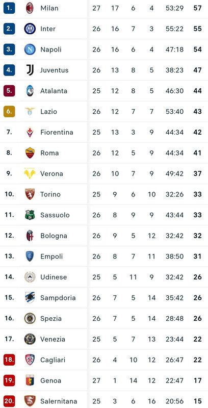 La Salernitana, dopo il pareggio contro il Bologna, il quarto consecutivo in campionato, sale a quota 15 punti ma resta all'ultimo posto a -7 dalla zona salvezza. Il Bologna, invece, raggiunge quota 32 punti e sale momentaneamente al 12° posto. Ecco la classifica provvisoria del campionato di Serie A: