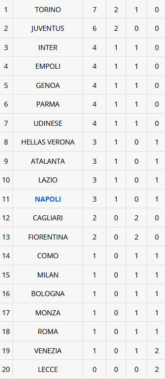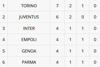 Il Torino vince di misura in casa del Venezia e si porta in vetta alla classifica a quota 7 punti, a +1 dalla Juventus. Di seguito la classifica provvisoria di Serie A.