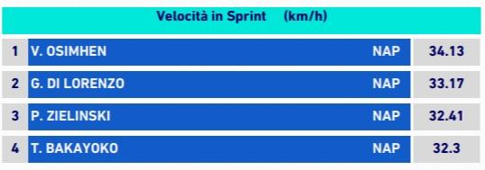 Dalla tabella della Lega Serie A sulla partita Fiorentina-Napoli, si evince come in campo i giocatori del Napoli si siano fratti strada tra le fila viola grazie alla loro alta velocità. Infatti Victor Osimhen, uno dei migliori della partita, ha toccato la velocità massima di 34,13 km/h, seguito da Giovanni Di Lorenzo (33,17). Una velocità senza dubbio fuori dal comune, visto è considerato che il caciatore più veloce al mondo ad oggi è Alphonso Davies del Bayern Monaco, che ha fatto registrare una velocità di 36,51 km/h.