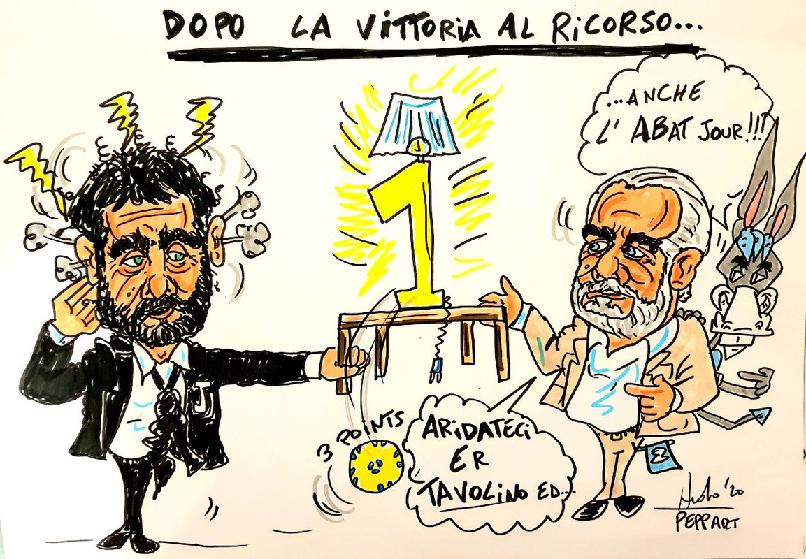 Giuseppe Avolio PeppArt ha inviato a "Napoli Magazine" la sua vignetta ispirata al ricorso del Napoli accolto dal Collegio di Garanzia del Coni che ha annullato lasconfitta a tavolino per 3-0 contro la Juventus ed il punto di penalizzazione per la squadra partenopea.