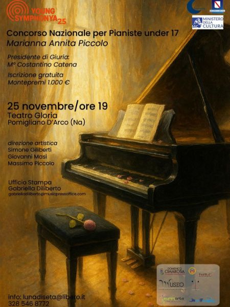 Martedì 25 novembre, alle ore 19.00, al Teatro Gloria (Via Carlo Poerio – 3) di Pomigliano D’Arco (Na), nell’ambito della rassegna di musica classica “Young Symphonya 2025”, organizzata dall’Associazione Luna di Seta, con la direzione artistica di Simone Giliberti, Giovanni Masi e Massimo Piccolo, si svolgerà il Premio nazionale per giovani pianiste (under 17) dedicato a Marianna Annita Piccolo.