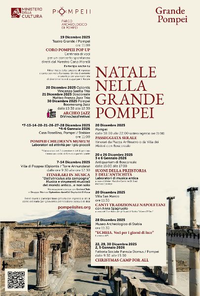Un ricco calendario di appuntamenti per le festività natalizie al Parco Archeologico di Pompei per famiglie, bambini, e adulti. Il filo conduttore sarà la musica, che in più forme e in più date accompagnerà la visita dei turisti nei siti della Grande Pompei. Tra performance musicali, laboratori didattici e itinerari tematici, i siti si trasformeranno in uno spazio creativo e accogliente in un’atmosfera di piena festa.