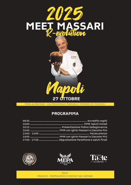 Nato nel 2018, “Meet Massari R-evolution” è oggi un punto di riferimento per la formazione di alto livello rivolta ai professionisti dell’arte bianca. Dopo aver toccato città come Milano, Barcellona, Tokyo, Parigi e Londra, il tour ha fatto tappa a settembre anche all’IBIE di Las Vegas, il principale evento dedicato alla pasticceria negli Stati Uniti. Napoli rappresenta l’ultima e unica tappa italiana del 2025, confermando il ruolo centrale dell’Italia nel panorama internazionale dell’alta pasticceria.