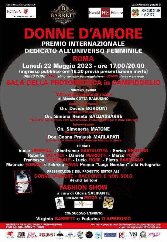 Lunedì, 22 maggio 2023, dalle ore 17,00 (ingresso pubblico ore 16,30) in Campidoglio (Sala della Protomoteca) a Roma, si svolgerà l’Evento “Donne D’Amore” promosso dall’On. Davide Bordoni, Consigliere Capitolino, e organizzato dall'Associazione Naschira (partner di Barrett International Group di Virginia Barrett, operante da tempo sul territorio Nazionale ed Internazionale in ambito sociale e culturale), in collaborazione con la Casa Editrice “Herald Editore” di Roma e con il Patrocinio gratuito della Presidenza dell’Assemblea Capitolina e della Regione Lazio.