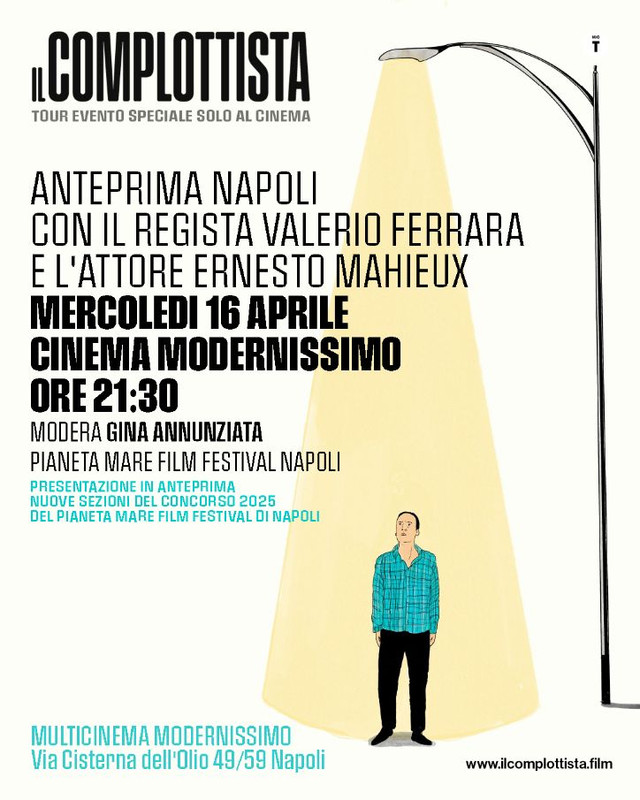 “La distribuzione in tour de “Il complottista” - spiega Valerio Ferrara - ha lo stesso spirito del “Giro d’Italia” tra la gente della quarta edizione del PMFF. Siamo partiti il 2 Aprile da Bologna e già solo nel primo mese toccheremo quasi tutte le regioni italiane (dal Veneto alla Sardegna) con ben tre tappe campane (programma completo delle proiezioni su www.ilcomplottista.film). Ma soprattutto i temi di questo mio primo lungometraggio sono ben connessi al lavoro di formazione dei nostri Film Labs all’interno dei quali , anche con la partecipazione di ragazzi e ragazze a rischio abbandono scolastico e criminalità giovanile, insegnamo l’utilizzo artistico e tecnico professionale dello smartphone per la produzione di cortometraggi a budget zero per raccontare storie ed esperienze di vita e buone pratiche di sostenibilità ambientale su argomenti come i cambiamenti climatici, la biodiversità e la protezione del patrimonio artistico e naturale attorno ai quali bisogna tutelarsi anche da disinformazione, fake news e sindromi di complottismo”.