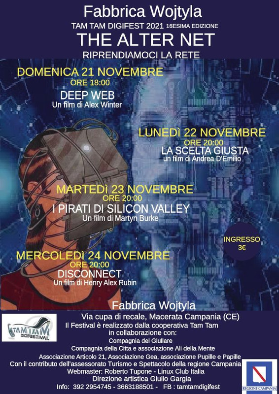 Domenica 21 novembre alla Fabbrica Wojtyla di Macerata Campania inizia una nuova sessione delle proiezioni del Tam Tam Digifest. Il tema di questa edizione è THE ALTER NET- riprendiamoci la Rete.
