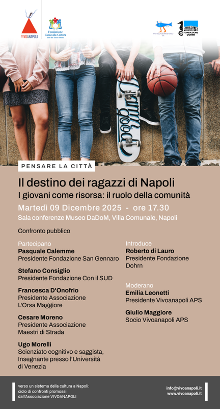 Vivoanapoli, Fondazione Dohrn, Amici dell’Acquario organizzano per martedì 9 dicembre, ore 17.30, sala conferenze Museo DaDoM (villa comunale) l’incontro sul “Destino dei ragazzi di Napoli. I giovani come risorsa: il ruolo della comunità”.