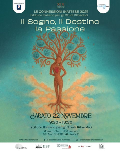 Sabato 22 Novembre 2025, dalle ore 9.00 alle 13.30, presso l’Istituto Italiano per gli Studi Filosofici - Palazzo Serra di Cassano - Napoli, si terrà la XIX edizione del Convegno Le Connessioni Inattese dal titolo ‘IL SOGNO, IL DESTINO, LA PASSIONE’ organizzato dall’Associazione Culturale ALTANUR che nasce nel lontano 1997 con l’obiettivo di  promuovere la cultura e la connessione fra le varie discipline in cui troppo spesso si vuol frammentare lo studio della realtà.