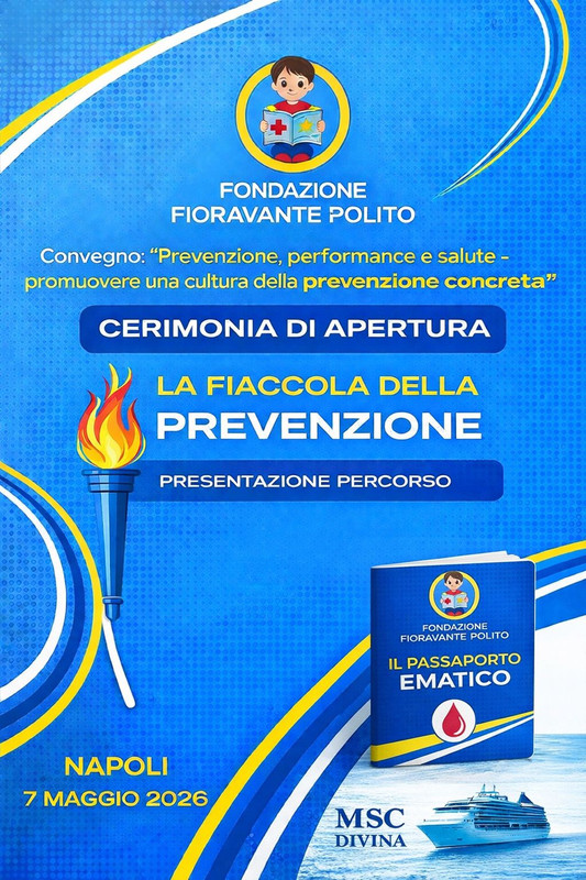 La Fondazione Fioravante Polito annuncia la cerimonia di apertura del convegno “Prevenzione, performance e salute – promuovere una cultura della prevenzione concreta”, un appuntamento dedicato alla diffusione della cultura della prevenzione sanitaria e sportiva. L’evento si terrà il 7 maggio 2026 a Napoli, a bordo della nave da crociera MSC Divina.