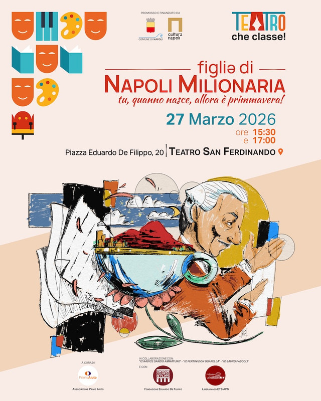 Sarà il Teatro San Ferdinando, tempio della drammaturgia eduardiana, a ospitare il gran finale di “FIGLI? DI NAPOLI MILIONARIA! TU, QUANNO NASCE, ALLORA È PRIMMAVERA!”, il progetto teatrale extracurricolare che ha coinvolto 64 studentesse e studenti delle scuole secondarie di primo grado dei territori di Scampia, Secondigliano e Poggioreale.