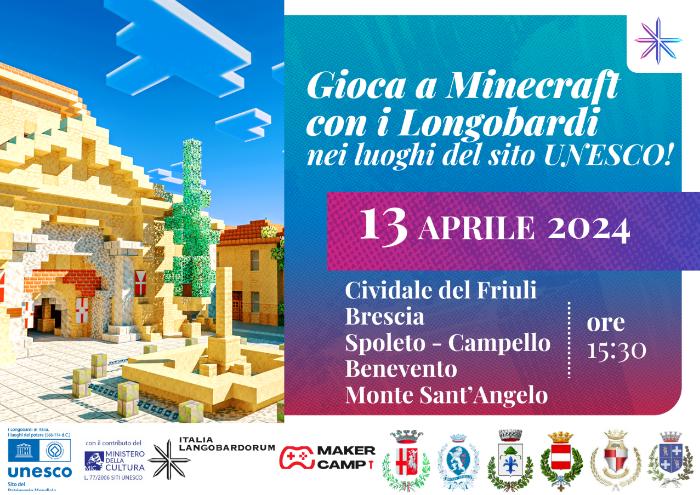 Sabato 13 aprile 2024 la città campana di Benevento sarà in rete con le sette località del sito seriale UNESCO "I Longobardi in Italia. I luoghi del potere (568-774 d.C.)" per una giornata di gioco promossa con l’obiettivo di presentare ufficialmente al pubblico, in modo coordinato, le due nuove mappe Longobarde ideate per il videogioco Minecraft.