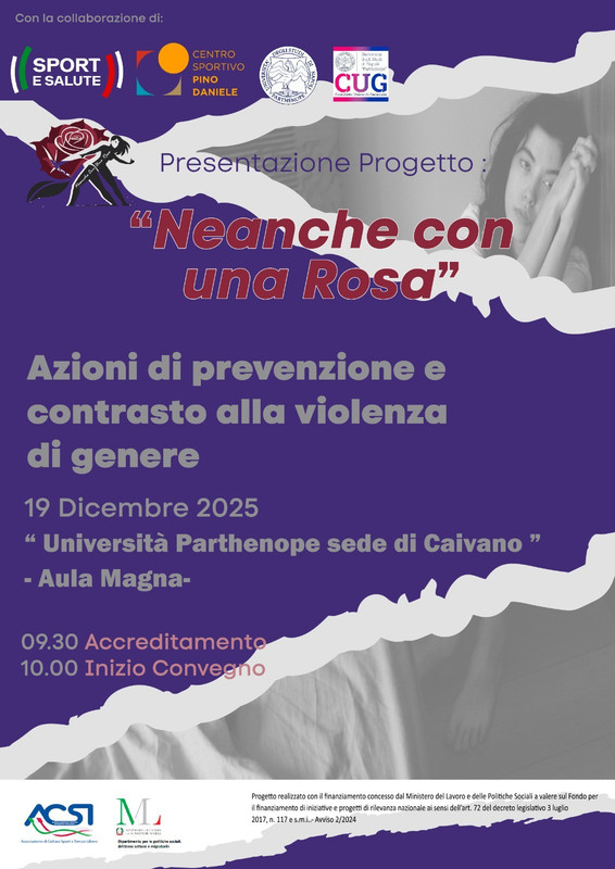 Il progetto nazionale “Neanche con una rosa”, promosso da ACSI – Associazione di Cultura Sport e Tempo Libero, e finanziato dal Ministero del Lavoro e delle Politiche Sociali, approda il 19 dicembre a Caivano, presso la sede dell’Università degli Studi di Napoli Parthenope, per una nuova tappa dedicata alla prevenzione e al contrasto della violenza sulle donne.
