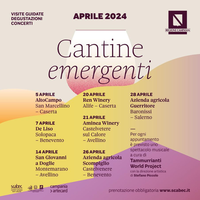 Il tour farà tappa il 5 aprile alla Grotta Altocampo di San Marcellino (CE), il 7 aprile alle Cantine De Liso di Solopaca (BN), il 14 aprile alla Cantina San Giovanni a Doglie di Montemarano (AV), il 20 aprile alla Rèn Wine di Alife (CE), il 21 aprile alla Aminea Winery di Castelvetere sul Calore (AV), il 26 aprile all’Azienda Agricola Scompiglio di Castelvenere (BN) e il 28 aprile nell’Azienda Agricola Guerritore di Baronissi (SA).