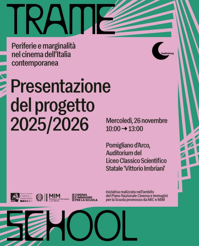 Mercoledì 26 novembre, nell’Auditorium del Liceo Imbriani di Pomigliano D’Arco - Na (Via Pratola 20/22), dalle ore 10.00 alle ore 13.00, si svolgerà la presentazione del progetto “Trame school – Periferie e marginalità nel cinema dell’Italia contemporanea 2025/2026” che continua a interrogare il nostro tempo là dove spesso lo sguardo pubblico non arriva: nelle periferie, reali e simboliche, che attraversano l’Italia dei nostri giorni. L’iniziativa, realizzata nell’ambito del Piano Nazionale Cinema e immagini per la Scuola promosso da MIC e MIM, rimette al centro gli sguardi, le storie e i territori che chiedono attenzione, per continuare a costruire un cinema che illumina ciò che troppo spesso resta ai margini.