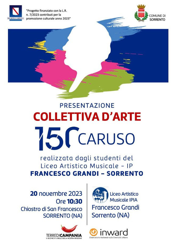L’Associazione Terre di Campania APS, nell’ambito delle sue attività culturali tese alla valorizzazione e promozione delle eccellenze della regione Campania, presenta il suo nuovo progetto “Caruso 150”, dedicato alla celebrazione del 150° anniversario della nascita di Enrico Caruso, tenore di fama mondiale, tra le personalità maggiormente rappresentative della nostra terra. Obiettivo del progetto è la realizzazione di una collettiva d’arte attraverso le opere create da una selezione di studenti del Liceo Artistico Musicale - IP Francesco Grandi di Sorrento (NA), città intimamente legata alla figura di Caruso, il quale qui scomparve nel 1921. Gli allievi frequentanti i vari indirizzi di studio dell’Istituto Scolastico, scelto come partner dell’iniziativa, dopo un incontro di formazione e approfondimento, coordinato da INWARD – Osservatorio Nazionale sulla Creatività Urbana, si sono cimentati nella realizzazione di opere, ispirate anche al concetto di creatività urbana, dedicate alla figura di Caruso. Le forme espressive utilizzate afferiscono a vari ambiti, come la pittura, la scultura, ma anche alla grafica e l’arte dell’intaglio. Grazie alla collaborazione con il Comune di Sorrento, le opere realizzate saranno esposte, per la prima volta, presso il Chiostro di San Francesco, lunedì 20 novembre, a partire dalle ore 10,30. Successivamente la Collettiva d’arte sarà ospitata presso il Museo MAV di Ercolano, dal 27 novembre al 1° dicembre, ed infine il 15 dicembre presso il Laboratorio Culturale “Campania bellezza del Creato” in Sant’Anastasia (NA). Il Progetto è finanziato dalla Regione Campania con la L.R. n. 7/2003, contributi per la promozione culturale anno 2023.