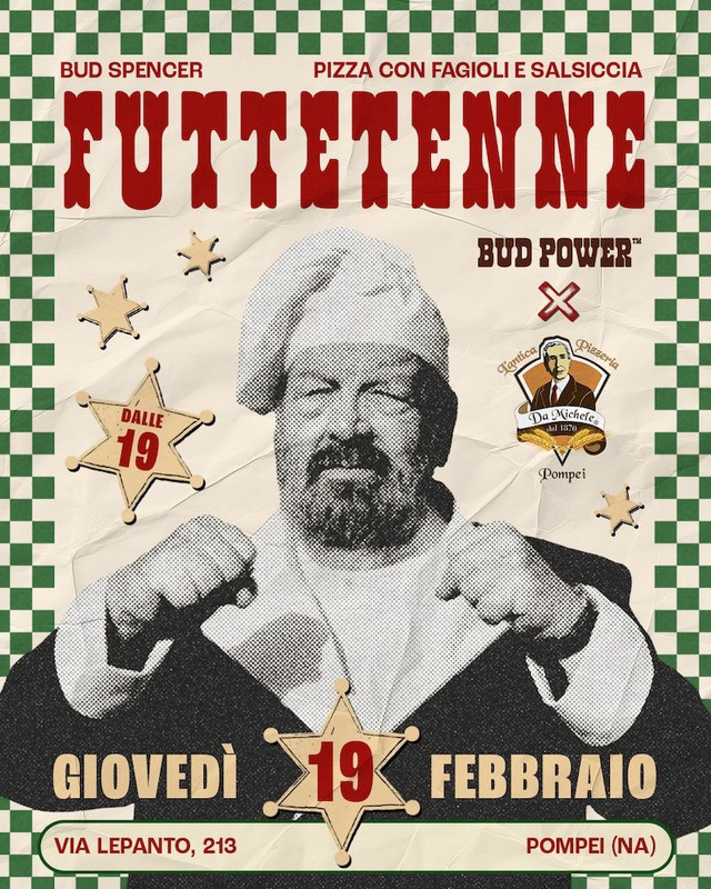 L’evento "Futtetenne" celebra l’offerta gastronomica speciale del mese di febbraio, attiva nelle sedi di Aversa, Pompei, Salerno e Caserta, dedicata a un’icona intramontabile: Bud Spencer. Un omaggio che unisce il piatto simbolo di Napoli al "gigante buono" più amato del cinema.