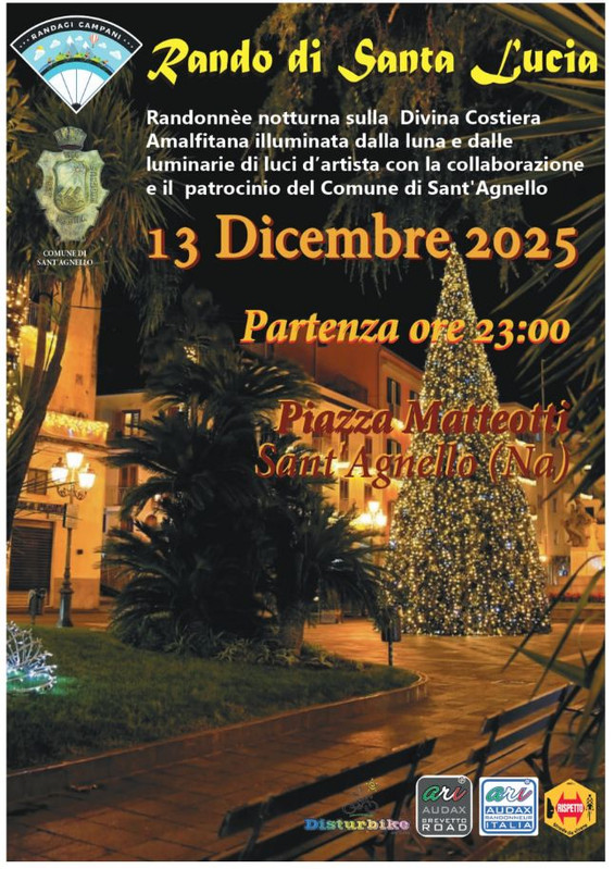Il Comune di Sant'Agnello ospita "La Randonnée delle Luminarie di Santa Lucia", l’evento ciclistico in notturna che partirà da Piazza Matteotti alle 23:00 del 13 dicembre, alla presenza del Sindaco Antonino Coppola, e farà ritorno sempre a Sant’Agnello la mattina seguente, dopo aver percorso la Costiera Sorrentina e Amalfitana.