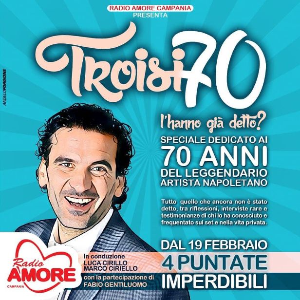 Radio Amore Campania, di Daniele Ivan Romano, ricorderà Massimo Troisi con uno speciale in quattro puntate dal titolo “Troisi 70, l’hanno già detto?”, ovvero – riprendendo un passaggio di una intervista rilasciata a Gianni Minà dopo il primo scudetto del Napoli nel 1987 - un modo per provare a dire tutto quello che non è ancora stato detto sul grande pensatore partenopeo tra cinema, religione, amicizia, amore e calcio. In conduzione Luca Cirillo, con la partecipazione di Fabio Gentiluomo, attore e ricercatore di materiale legato all’artista, che leggerà passaggi di interviste rare rilasciate da Troisi. Ogni puntata è impreziosita dagli editoriali di Marco Ciriello, scrittore e giornalista. Al montaggio e alla parte tecnica l’insostituibile Vico Marcone. Fondamentale, in redazione, il lavoro di Antonella Esposito ed Irene Romano. Tanti gli ospiti che interverranno: Giancarlo Governi, Massimo Lopez, Anna Pavignano, Angelo Orlando, Enzo Decaro, Anna Carlucci, Toni Malco, Alfredo Cozzolino, Loppa Massimo Bianchi, Tommy Mandato Due, Gaetano Amato, Bruno Giordano, Andrea Carnevale, Patrizio Oliva, Stefano Veneruso e Valeria Veneruso, Antonio Romano, Ernesto Cataldo, Francesco Malapena (che ha curato anche la sigla), Ermanno De Simone, Angelo Forgione (autore della grafica), Adriano Pastore, Giuseppe Avolio e Ciro Borrelli. “Troisi 70, l’hanno già detto?”, andrà in onda dal 19 al 22 febbraio, ore 9:20 (e in replica alle 19:00), su Radio Amore e Radio Amore Napoli.