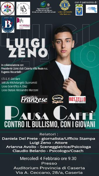 Un nuovo appuntamento del format nazionale “Pausa Caffè – Contro il Bullismo, con i Giovani” approda a Caserta, con un incontro speciale dedicato agli studenti e alla prevenzione del bullismo. L’evento si terrà mercoledì 4 febbraio alle ore 9:30 presso l’Auditorium della Provincia di Caserta con il patrocinio dell' Associazione Stampa Campana- Giornalisti Flegrei della Provincia di Caserta. Protagonista dell’incontro sarà il giovane attore e testimone sociale Luigi Zeno, volto emergente del cinema italiano, protagonista della serie Minerva - La Scuola di Netflix, premiato per il suo impegno sociale e per la sua interpretazione nel cortometraggio La Linea Sottile, che affronta con intensità il tema del bullismo giovanile.