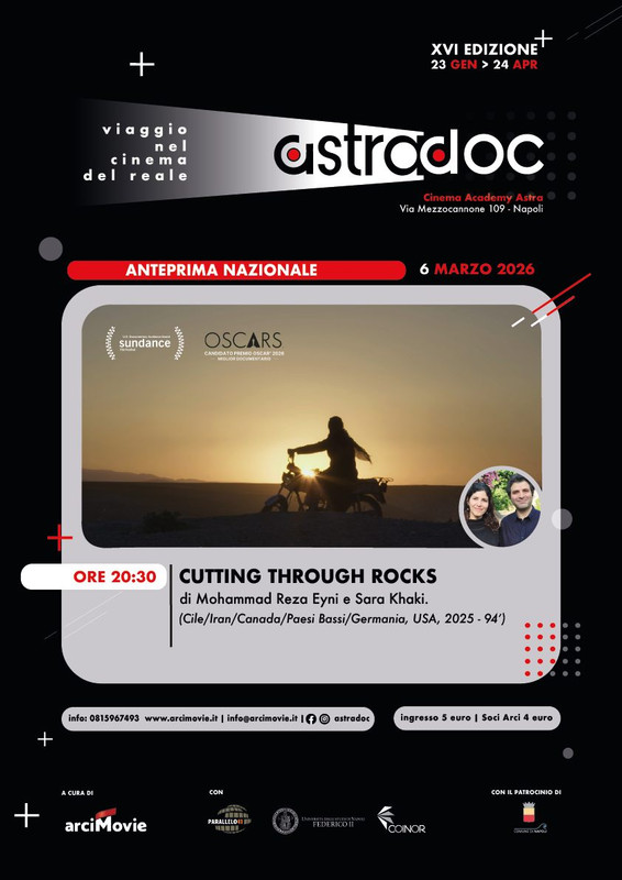 Una anteprima nazionale apre la seconda parte di AstraDoc, la rassegna dei documentari di Arci Movie giunta alla XVI edizione che si concluderà il 24 aprile. In occasione della Giornata internazionale della Donna venerdì 6 marzo alle 20:30 arriva sul grande schermo del cinema Astra di Napoli il film candidato agli Oscar 2026 come Miglior Documentario “Scalfire la roccia – Cutting Through Rocks” di Sara Khaki e Mohammad Reza Eyni, in anteprima nazionale grazie alla collaborazione con Wanted Cinema (il film sarà nelle sale dall’8 marzo).