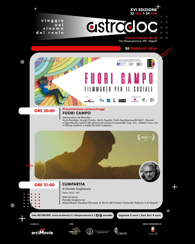 Doppio speciale appuntamento nella quinta tappa della XVI edizione della rassegna dei documentari AstraDoc che accoglie il ritorno di un grande protagonista del cinema documentario italiano. Al Cinema Astra Daniele Gaglianone presenta la sua ultima opera premiata al Festival dei Popoli 2025 con la menzione speciale al regista. Nella sala di via Mezzocannone anche la presentazione dei cortometraggi realizzati dai sei giovani filmmaker di "Fuori Campo – Filmmaker per il sociale", residenza artistica di Arci Movie. Appuntamento per venerdì 20 febbraio 2026 insieme a diversi ospiti.