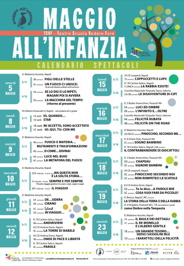 È entrata nel vivo l'8a edizione del Maggio all'infanzia Campania: la rassegna di teatro fatto dalla scuola in programma al Teatro dei Piccoli di Napoli, tutti i giorni, per oltre 2 settimane. Fino al 23 maggio, alle 11 e alle 16, di fronte ad un pubblico di famiglie e scuole, la manifestazione porterà in scena i 45 spettacoli realizzati dai 931 studenti di 10 istituti scolastici tra Napoli, Pozzuoli e Salerno nell'ambito del pluripremiato progetto TEATRO SCUOLA VEDERE FARE (TSVF) ideato da Casa del Contemporaneo con Le Nuvole di Napoli e la collaborazione di AGITA e Casa dello Spettatore di Roma.