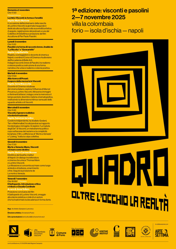 «Il Corso di Cinema e Audiovisivo dell'Accademia di Belle Arti di Napoli è lieta e onorata di collaborare alla rassegna Quadro – afferma Luigi Barletta, docente di Cinema all’Accademia –, rassegna dedicata in questa prima edizione a due Maestri del cinema italiano, Pasolini e Visconti. L'eccezionale luogo che ospiterà gli incontri e le proiezioni si trasformerà in un hub della cultura cinematografica, realizzando l’unica funzione possibile per la residenza elettiva del Maestro lombardo. Questo evento rappresenta il continuo del sempre più stretto rapporto di collaborazione tra il Comune di Forio e l'Accademia di Napoli che darà i suoi frutti nel corso degli anni.»