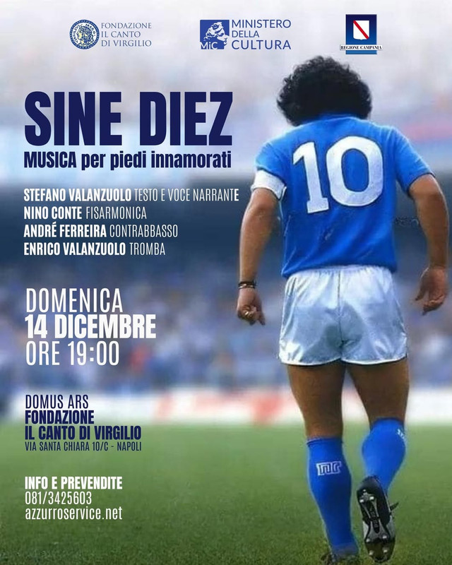 Si conclude con un appuntamento carico di emozione e identità l’ottava e ultima tappa della rassegna “TUTTA UN’ALTRA MUSICA”, prodotta dalla Fondazione Il Canto di Virgilio e dedicata alla sperimentazione e alla contaminazione tra generi. Sabato 14 dicembre, presso la sede della Fondazione in Via Santa Chiara, 10/c a Napoli, andrà in scena “Sine Diez – Cinque anni senza Diego”, un racconto musicale in omaggio a Diego Armando Maradona.