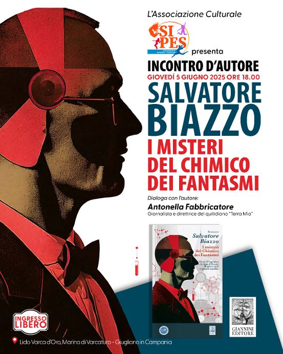 Incontri d’autore per il libro “I misteri del Chimico dei Fantasmi” di Salvatore Biazzo pubblicato dalla Giannini Editore, nella collana Romanzi dai Cinque Continenti; l’appuntamento è previsto per giovedì 5 giugno alle ore 18 al lido Varca d’Oro, Marina di Varcaturo, Giugliano in Campania. L’evento è organizzato dall’Associazione culturale Sipes, l’ingresso è libero. Dialoga con l’autore: la giornalista e direttrice del quotidiano Terra Mia Antonella Fabbricatore.