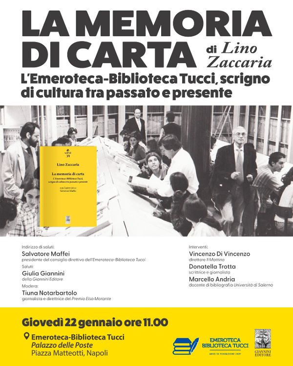Esistono luoghi che custodiscono l’anima di una città, attraverso le parole che ne hanno raccontato la storia giorno dopo giorno. Uno di questi luoghi, quasi magico, è l'Emeroteca Tucci e lo racconta il giornalista Lino Zaccaria nel suo ultimo libro “La memoria di carta”, pubblicato dalla Giannini Editore, nella collana Sorsi. La prima presentazione si terrà giovedì 22 gennaio alle ore 11 presso l’Emeroteca-Bilioteca Tucci, Palazzo delle Poste, Piazza Matteotti, Napoli. Dopo gli indirizzi di saluto del presidente del consiglio direttivo dell’Emeroteca-Bibioteca Tucci Salvatore Maffei e di Giulia Giannini della Giannini Editore, interverranno: il direttore de Il Mattino Vincenzo Di Vincenzo, la scrittrice e giornalista Donatella Trotta e il docente di bibliografia dell’Università di Salerno Marcello Andria. Modererà Tiuna Notarbartolo, giornalista e direttrice del Premio Elsa Morante.