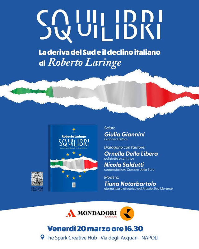 Un incontro importante con Roberto Laringe, che presenterà il suo libro “Squilibri” venerdì 20 marzo alle ore 16,30, presso la libreria The Spark Creative Hub, via degli Acquari, Napoli. Il libro è pubblicato dalla Giannini Editore nella collana Stella del Sud. Dopo i saluti di Giulia Giannini della Giannini Editore, dialogheranno con l’autore: Nicola Saldutti caporedattore del Corriere della Sera e Ornella Della Libera poliziotta e scrittrice. Modererà la giornalista e direttrice del Premio Elsa Morante Tiuna Notarbartolo.